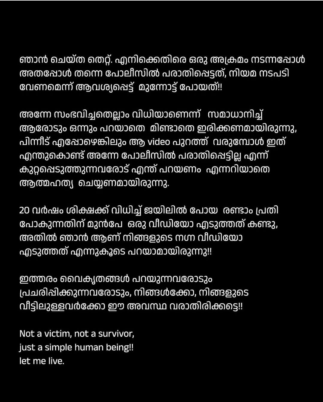 ഇത്തരം വൈകൃതങ്ങൾ പറയുന്നവരോടും പ്രചരിപ്പിക്കുന്നവരോടും, നിങ്ങൾക്കോ, നിങ്ങളുടെ വീട്ടിലുള്ളവർക്കോ ഈ അവസ്ഥ വരാതിരിക്കട്ടെ!!! Not a victim, not a survivor, just a simple human being!!! let me live എന്ന് പറഞ്ഞാണ് പോസ്റ്റ് അവസാനിക്കുന്നത്.